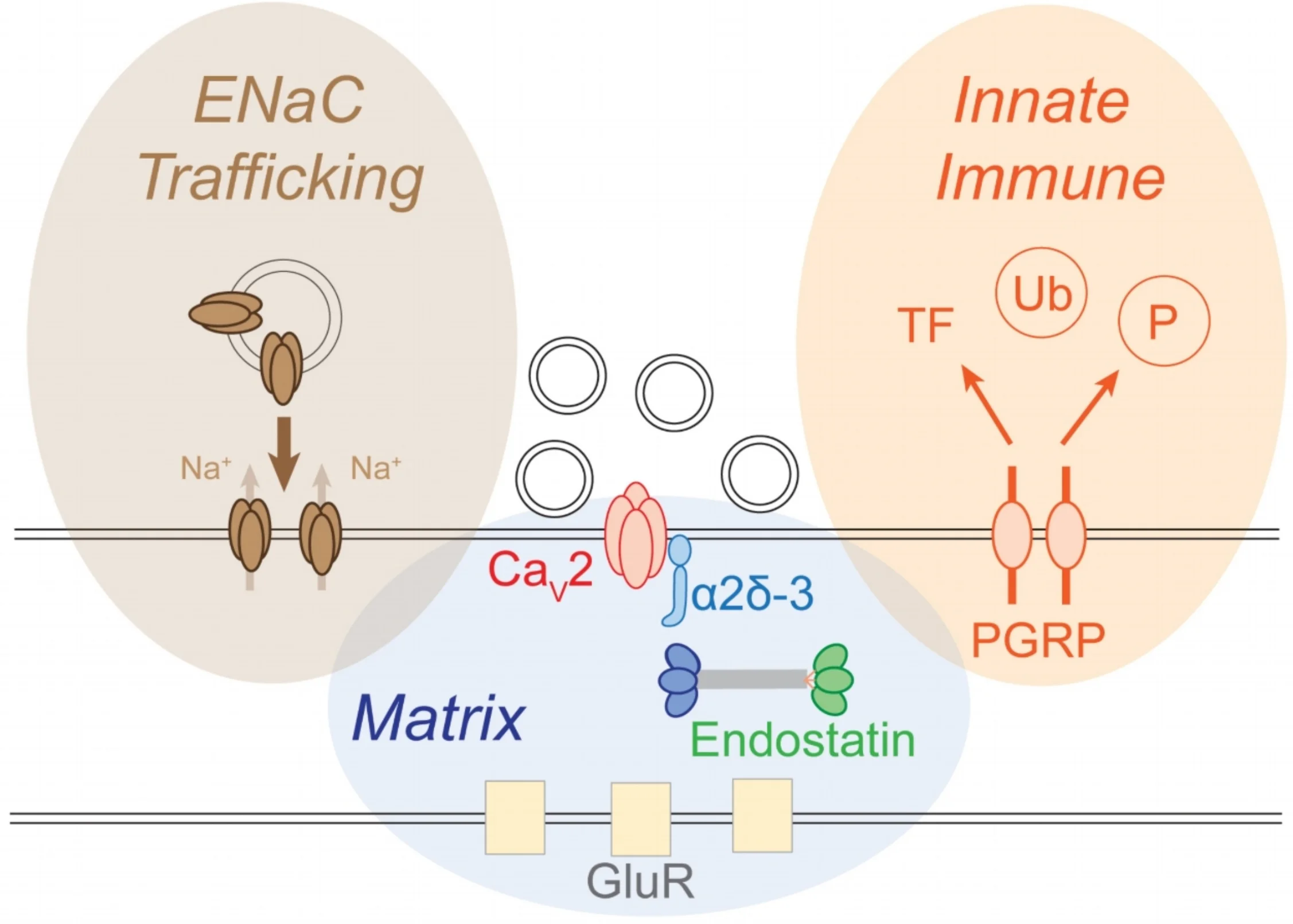 Diagram of a synapse. The presynaptic release site is centered upon the presynaptic calcium channel (Cav2). Neurotransmitter vesicles are released opposite to postsynaptic glutamate receptors (GluR). We have defined three major signaling systems that converge to achieve the homeostatic control of synaptic vesicle release, each defined by a brown, blue or orange oval. These mechanisms include the regulated insertion of ENaC channels (brown), release of signaling factors from the extracellular matrix (blue) and activation of innate immune signaling (orange).